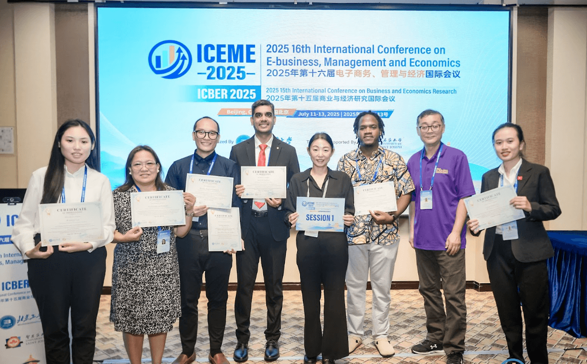 Vũ Minh Uyên (bìa phải) tại Hội nghị ICEME 2025 tại Bắc Kinh (Trung Quốc). Ảnh: MG