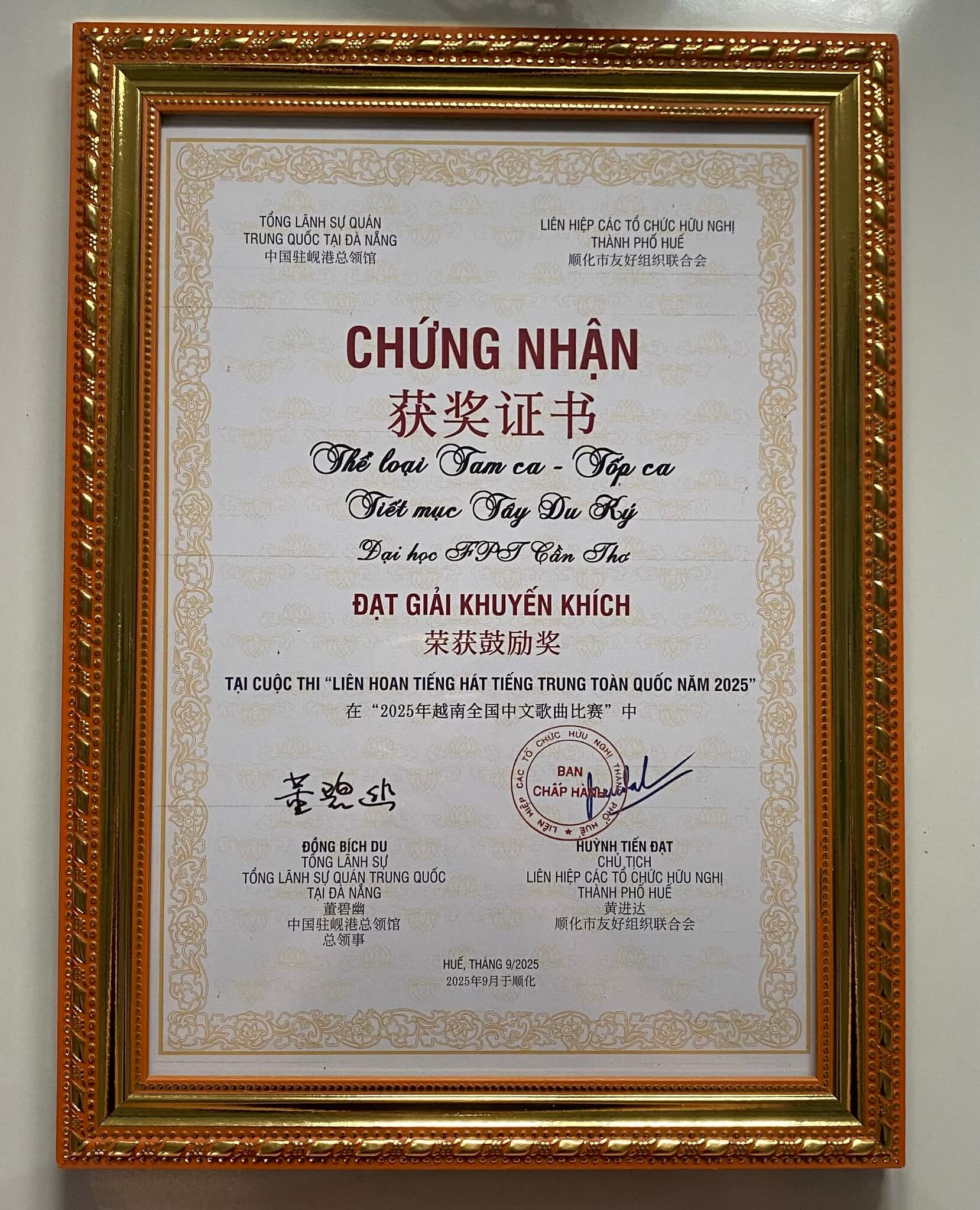 Một lần nữa, sinh viên Trường Đại học FPT lại ghi dấu ấn tại sân chơi văn hóa – nghệ thuật cấp quốc gia! Nhóm Hữu nghị Chi Âm gồm 4 sinh viên: Nguyễn Phước Trọng, Trần Thụy Mai Trân, Bùi Thị Bích Trâm và Võ Thanh Nhật với tiết mục “Tây Du Ký” đã xuất sắc giành Giải Khuyến khích tại cuộc thi “Liên hoan tiếng hát tiếng Trung toàn quốc năm 2025”, do Liên hiệp các tổ chức Hữu nghị và Hội Hữu nghị Việt – Trung TP. Huế phối hợp với Tổng Lãnh sự quán Trung Quốc tại Đà Nẵng tổ chức.