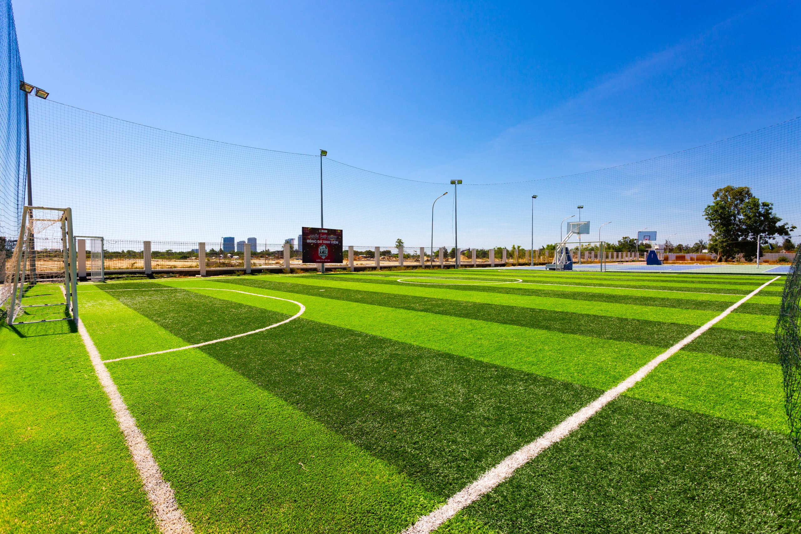 Sân bóng đá cỏ nhân tạo (1.500 m², 5–7 người) cùng hệ thống chiếu sáng, khung lưới, khu nghỉ và bãi xe.