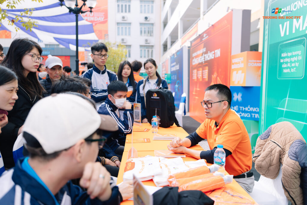 Tại khu vực gian hàng trải nghiệm, học sinh và phụ huynh sẽ được giới thiệu chi tiết về 36 chương trình đào tạo của Trường Đại học FPT. Mỗi gian hàng là một “bức tranh thu nhỏ” về ngành học, giúp người tham dự hiểu rõ nội dung chương trình, phương pháp đào tạo, kỹ năng sinh viên được trang bị cũng như cơ hội nghề nghiệp sau khi ra trường. Đây là cơ sở quan trọng để học sinh đối chiếu năng lực, sở thích cá nhân với từng hướng đi cụ thể.