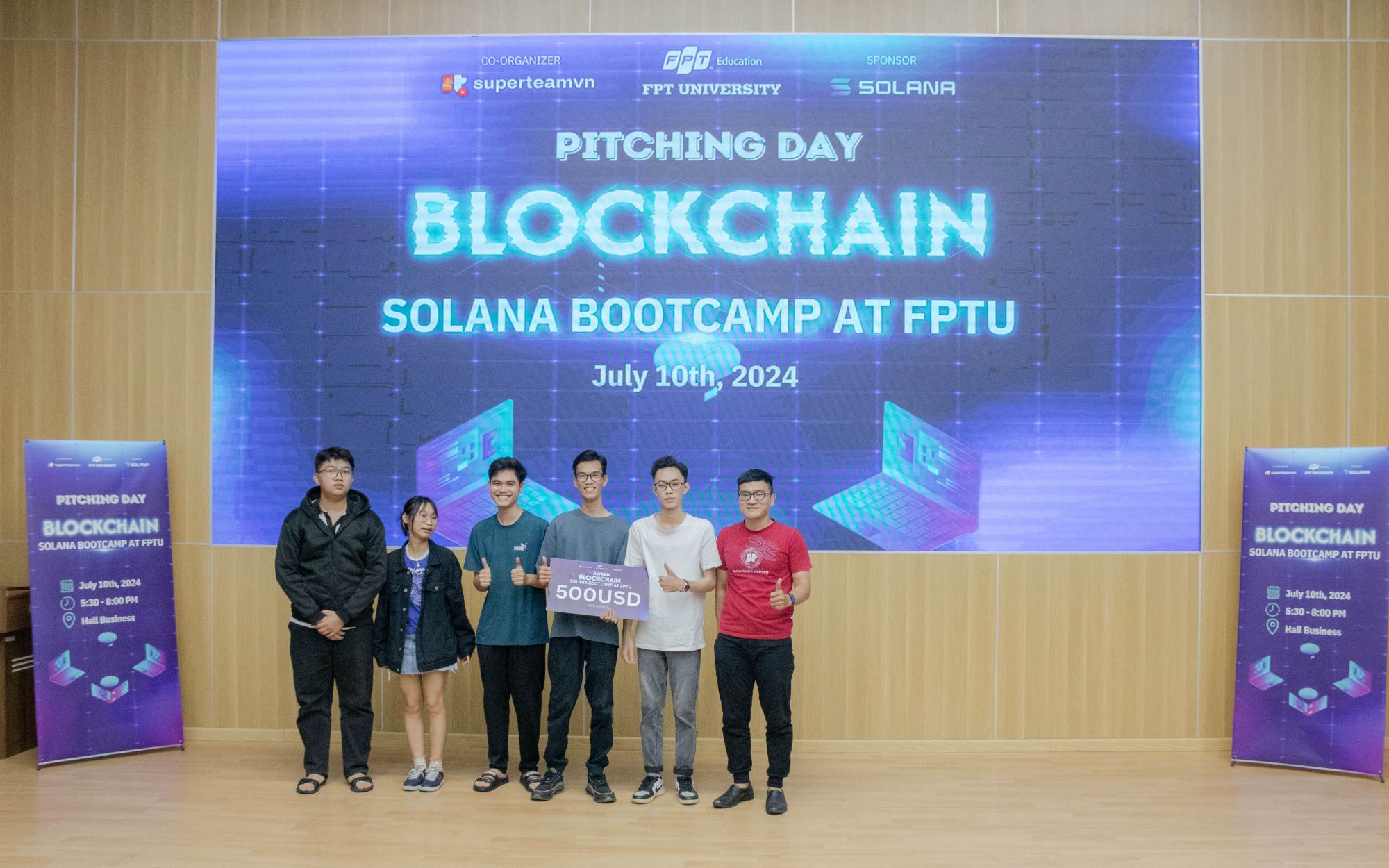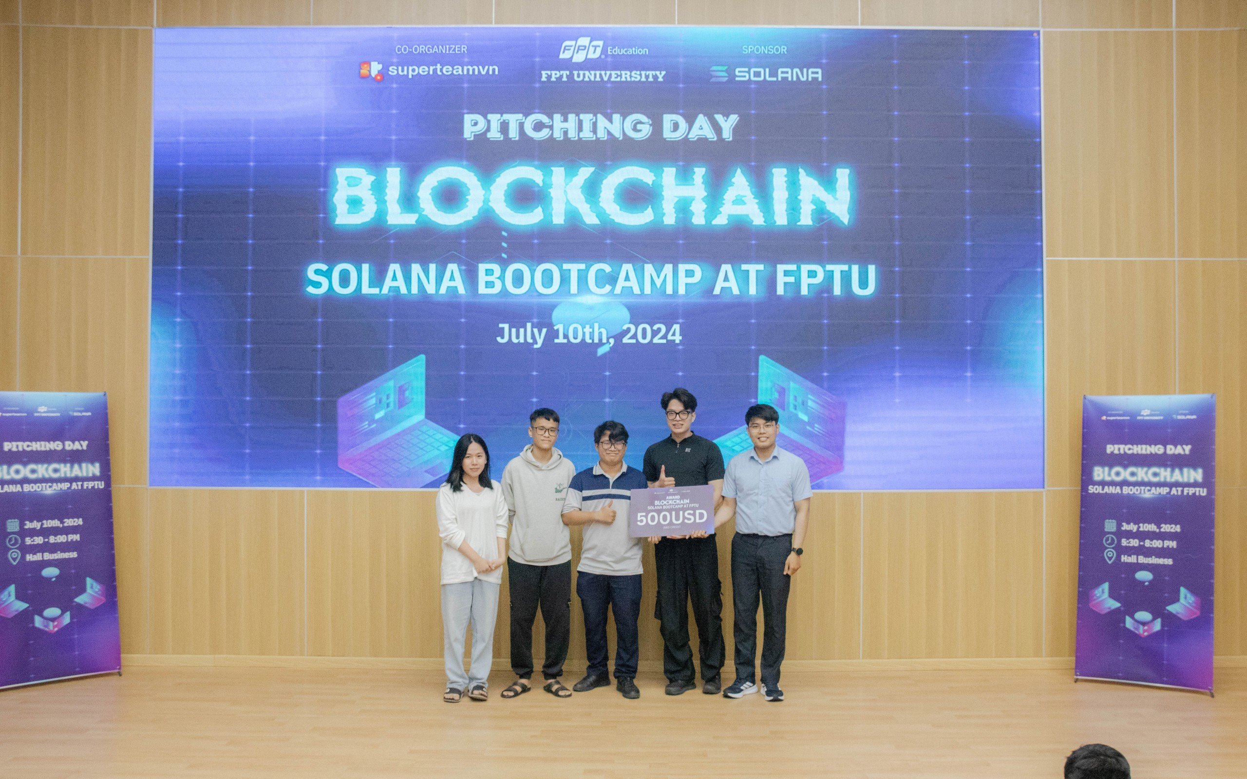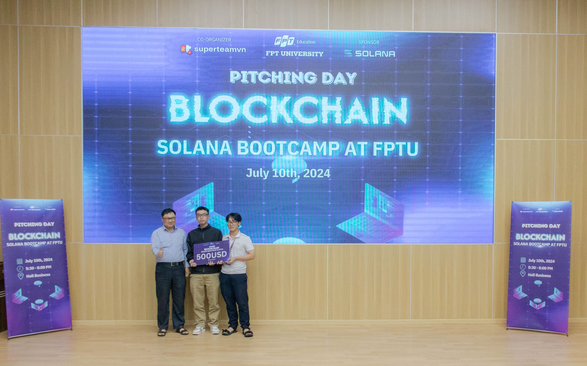 Ngày 10 tháng 7 năm 2024, tại Hội trường Business FPTU – HCMC Campus, buổi Pitching – Báo Cáo Dự Án của các học viên tham gia chương trình Blockchain Solana Bootcamp at FPTU đã diễn ra trong không khí đầy hào hứng và cạnh tranh sôi nổi. Đây là dịp để các nhóm học viên trình bày những ý tưởng sáng tạo và các giải pháp công nghệ đột phá của mình trước ban giám khảo và các nhà đầu tư tiềm năng. Hơn 30 nhóm tham gia lần này đều được đánh giá rất cao về mức độ sáng tạo, tính ứng dụng thực tiễn cũng như tiềm năng phát triển trong tương lai.
