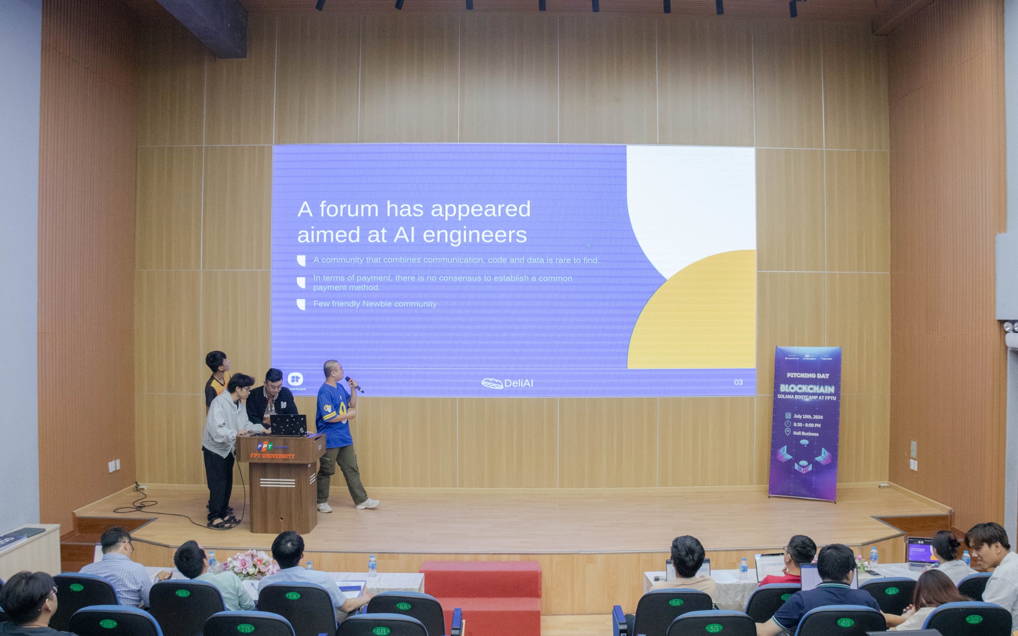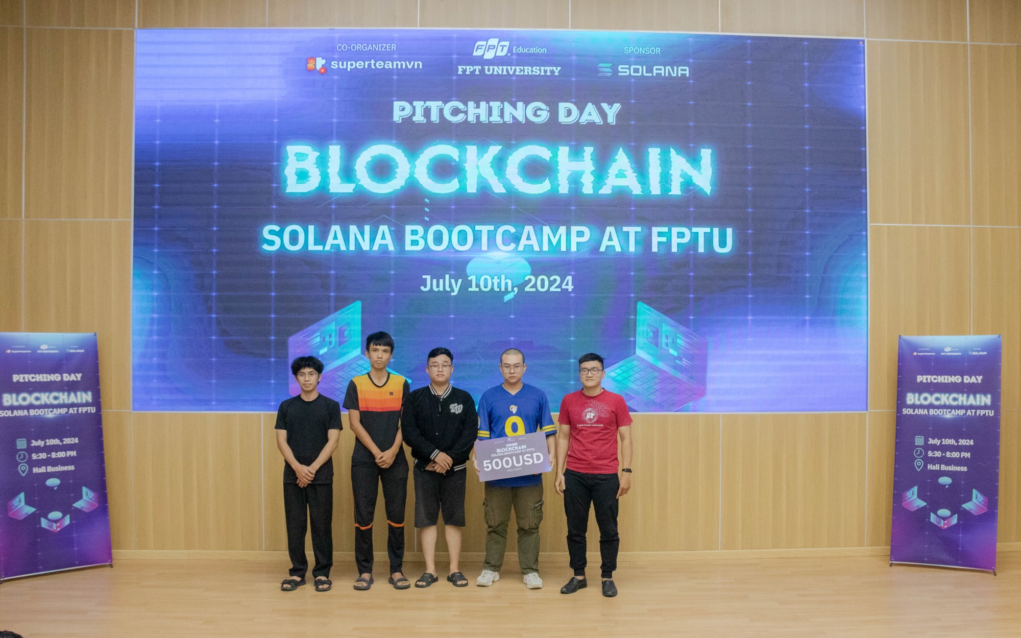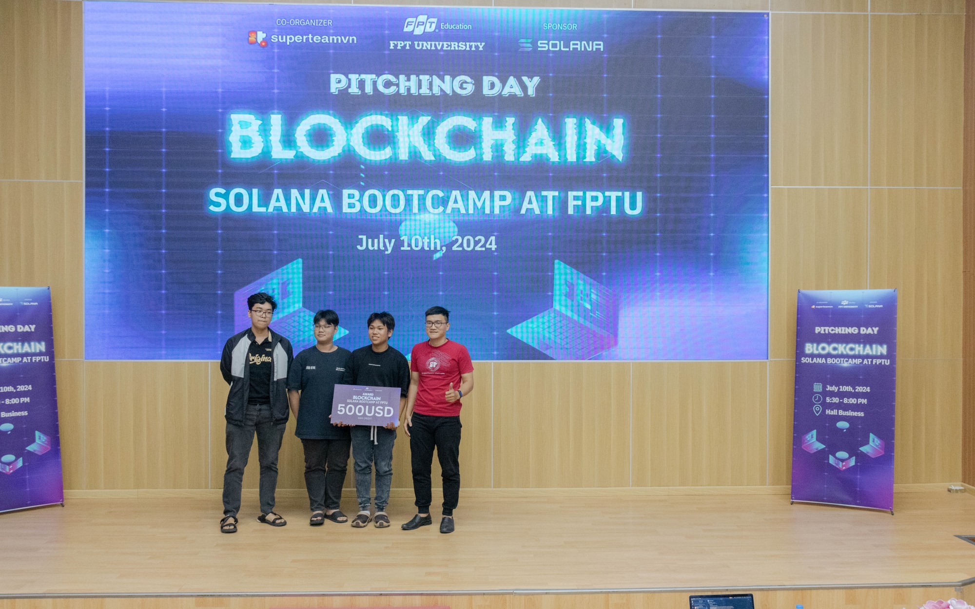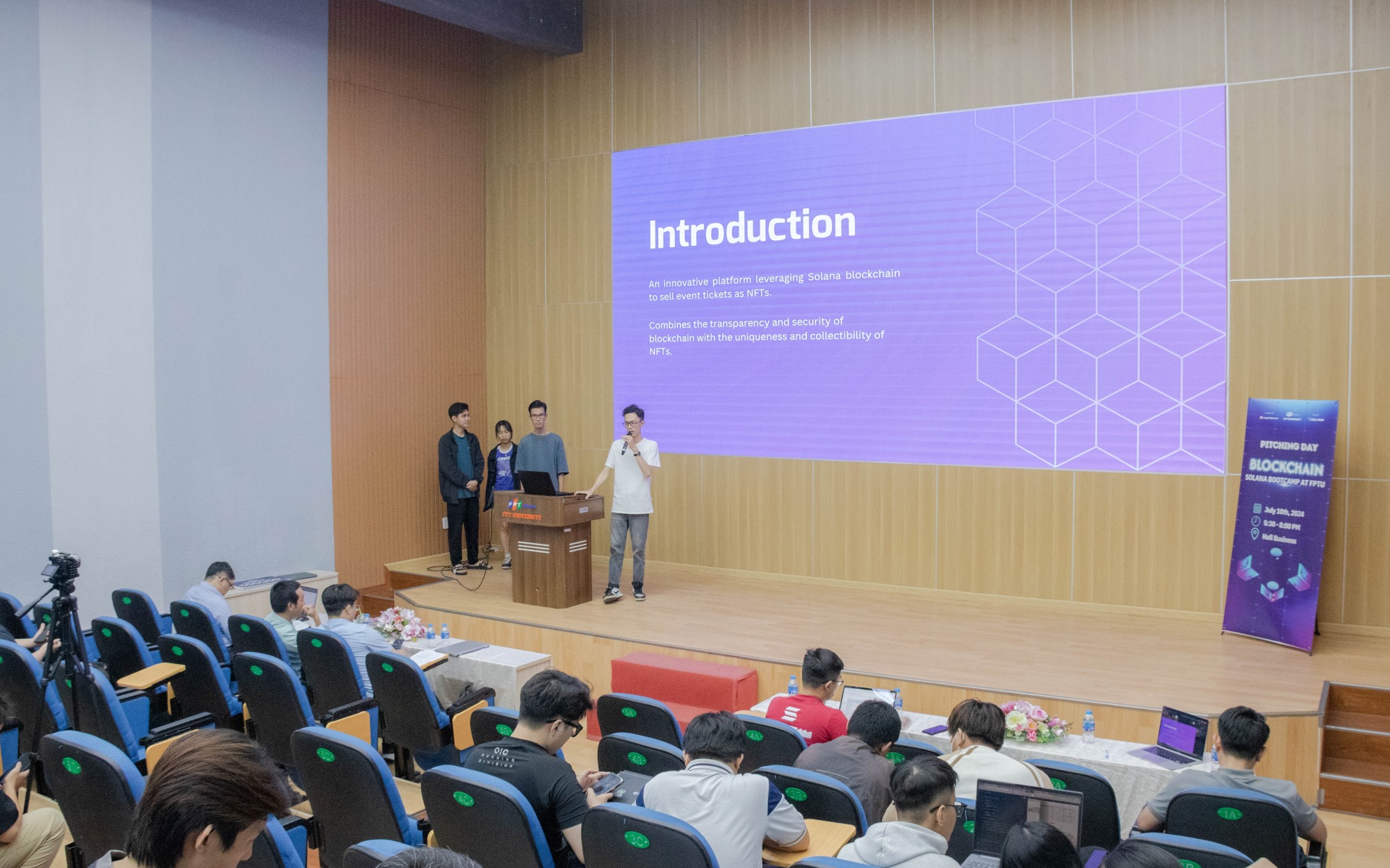 Ngày 10 tháng 7 năm 2024, tại Hội trường Business FPTU – HCMC Campus, buổi Pitching – Báo Cáo Dự Án của các học viên tham gia chương trình Blockchain Solana Bootcamp at FPTU đã diễn ra trong không khí đầy hào hứng và cạnh tranh sôi nổi. Đây là dịp để các nhóm học viên trình bày những ý tưởng sáng tạo và các giải pháp công nghệ đột phá của mình trước ban giám khảo và các nhà đầu tư tiềm năng. Hơn 30 nhóm tham gia lần này đều được đánh giá rất cao về mức độ sáng tạo, tính ứng dụng thực tiễn cũng như tiềm năng phát triển trong tương lai.