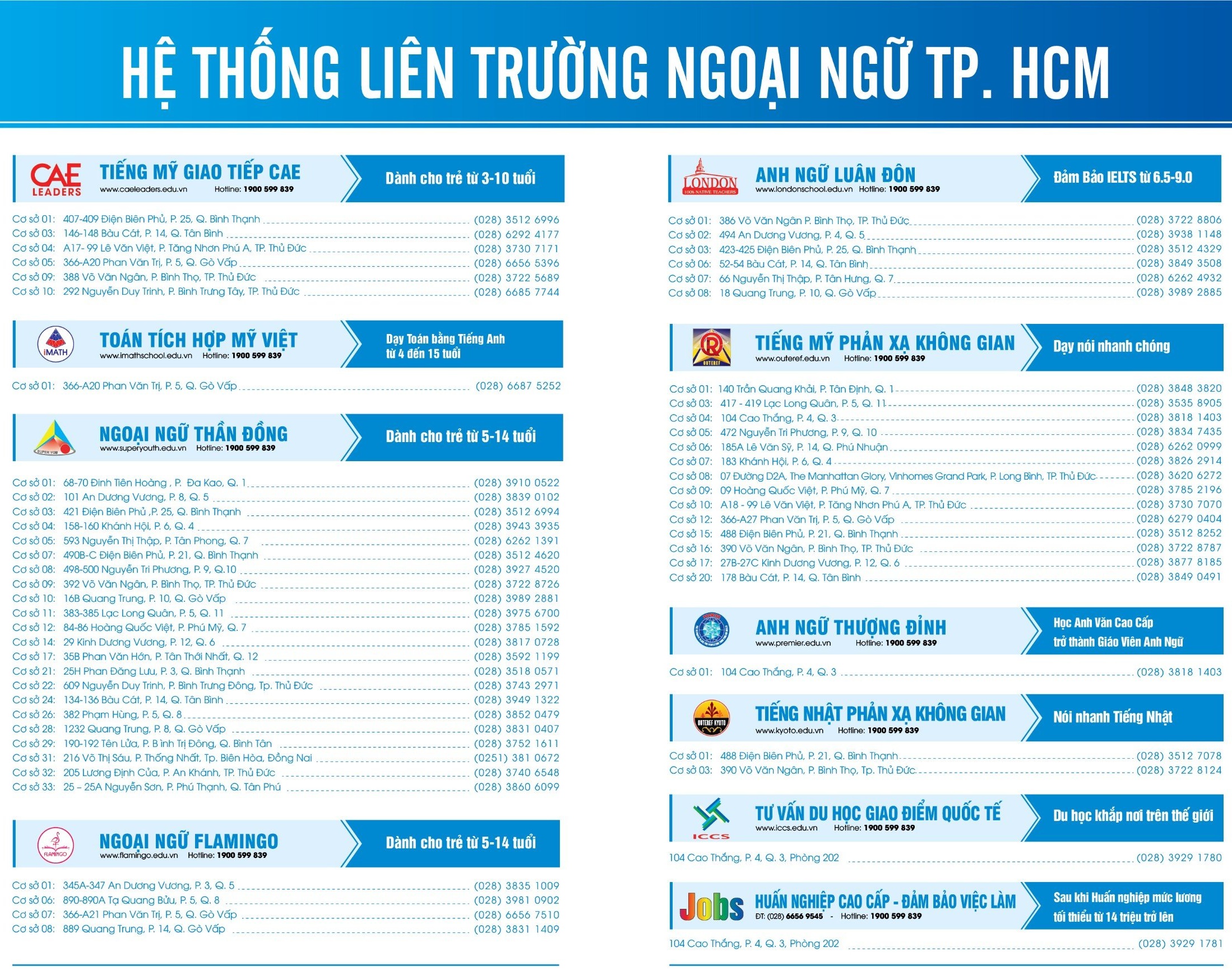 Với 100 cơ sở tại TP.HCM chuyên đào tạo Tiếng Anh, Tiếng Nhật lấy bằng cấp (Cambridge: Starters, Movers, Flyers, KET, PET, IELTS 6.5-9.0, CPE, SAT, TOEFL, TESOL… cho học viên từ 3 tuổi đến học sinh, sinh viên, người đi làm, người có nhu cầu xuất ngoại, định cư.