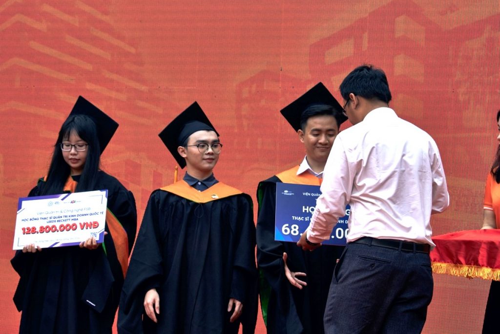 Trong khuôn khổ buổi lễ, nhiều học bổng danh giá đã được trao cho các tân cử nhân xuất sắc. Đại diện Bùi Quốc Huy, từ Viện Quản trị và Công nghệ FSB, đã trao học bổng MBA trị giá 68,4 triệu đồng cho tân cử nhân đạt thủ khoa Phan Minh Hiếu. Đây là một phần thưởng xứng đáng cho những nỗ lực không ngừng của Hiếu trong suốt quá trình học tập tại trường.