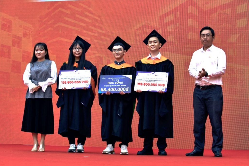 Bên cạnh đó, bà Lê Thị Kiều Hoa, Trưởng phòng tuyển sinh Thạc sĩ Liên kết Quốc tế, đã trao học bổng Leeds Beckett MBA trị giá 128,8 triệu đồng cho hai tân cử nhân đạt thủ khoa Bạch An Khang và Dương Hồng Ngọc. Những học bổng này không chỉ ghi nhận thành tích học tập xuất sắc mà còn mở ra cơ hội học tập quốc tế cho các bạn.