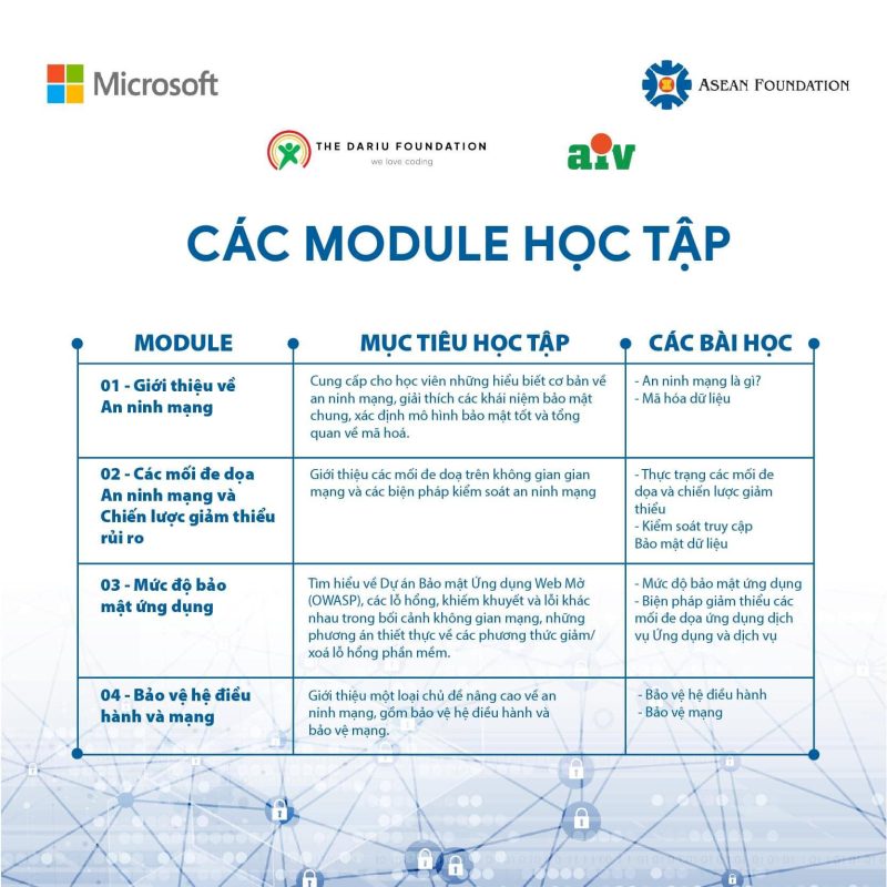Khoá học trực tuyến về An ninh mạng (Cyber Security) là một cấu phần thuộc dự án ASEAN Cybersecurity Skilling program, khởi xướng bởi Quỹ ASEAN và được tài trợ bởi Microsoft hướng tới nâng cao kỹ năng về An ninh mạng cho thanh niên tại các quốc gia Đông Nam Á.