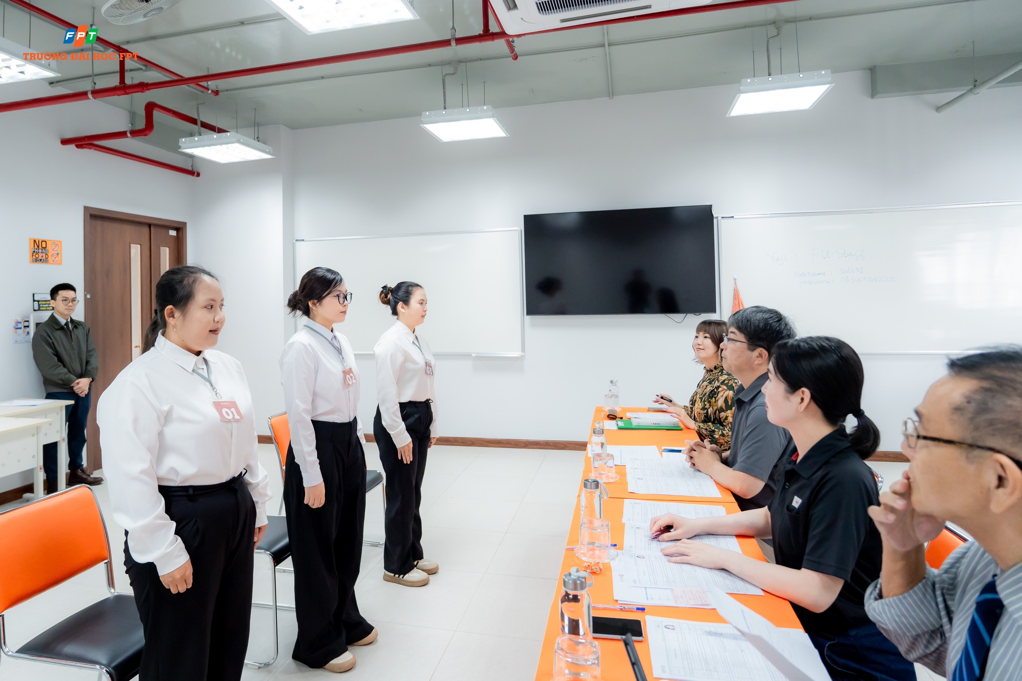 Tại buổi phỏng vấn OJT tại Nhật Bản, sinh viên được gặp trực tiếp nhà tuyển dụng Nhật Bản, tìm hiểu văn hóa doanh nghiệp và thể hiện kỹ năng giao tiếp, xử lý tình huống cùng tác phong làm việc chuyên nghiệp. Ngoài phần vấn đáp, sinh viên còn được đánh giá qua các bài test thực hành về độ nhanh nhạy, khả năng phân biệt màu sắc và tư duy logic – những tiêu chuẩn tuyển dụng đặc thù của doanh nghiệp Nhật Bản. Các bạn sinh viên Trường Đại học FPT đã thể hiện tốt và nhận được đánh giá tích cực từ phía doanh nghiệp.