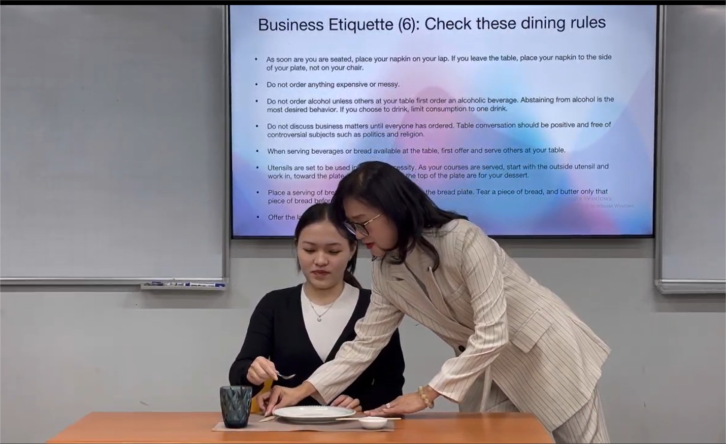 Ngay từ những buổi đầu, lớp học không dừng lại ở những khái niệm về tác phong hay quy chuẩn giao tiếp. Sinh viên được “ném” vào các tình huống mô phỏng, tranh luận nhóm, thuyết trình tức tốc và xử lý vấn đề dưới nhiều góc nhìn: nhân viên – quản lý – người giải quyết tình huống.