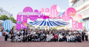 Các bạn 2K8 hào hứng check in tại cổng chào sự kiện Cultural Fest 2026.