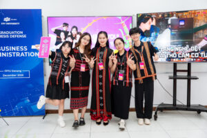 Những nụ cười tươi và ánh mắt tự hào của nhóm đồ án khi thành công mang đến Hội đồng bảo vệ khóa luận không gian văn hoá Cơ Tu rực rỡ, giàu bản sắc.