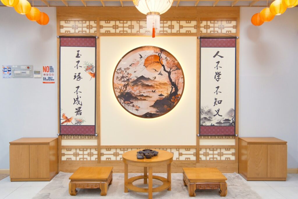 Khu trải nghiệm Nhật Bản tái hiện khung cảnh của những ngôi nhà truyền thống với bàn ghế thấp, sàn trải tatami và hệ thống cửa lùa shoji, tranh treo hình cổng torii và cá chép – biểu tượng cho sự may mắn và trường thọ trong văn hóa Nhật Bản. Trong khi đó, khu văn hóa Trung Quốc mang dấu ấn cổ điển, nổi bật với đèn lồng và những bức thư pháp, mang tinh thần nghệ thuật Trung Hoa. Ngoài ra, không gian này còn được trang trí bằng tranh phong cảnh núi non và bàn trà gỗ, tái hiện vẻ đẹp thanh tao của văn hóa trà đạo Trung Quốc.